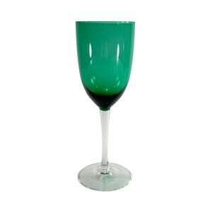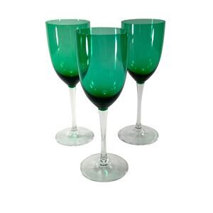 These 3 wine glasses are in great previously owned condition. There are no chips or cracks. They look like they've only seen light use. The color is not an Emerald green but leans more toward a Teal Green.