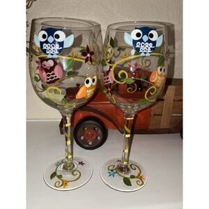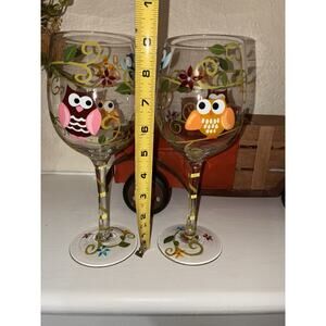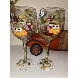 Wine Goblet Glasses Hand Painted Owls Set of 2