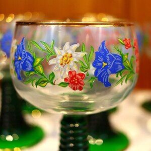 Handpainted France Green Stem Vintage Glass Goblet Set. Wine Romer alpine flowers