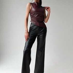 Wine Red Preppy Women's Motorcycle Solid PU Asymmetric Ruched Waist Tank Top