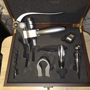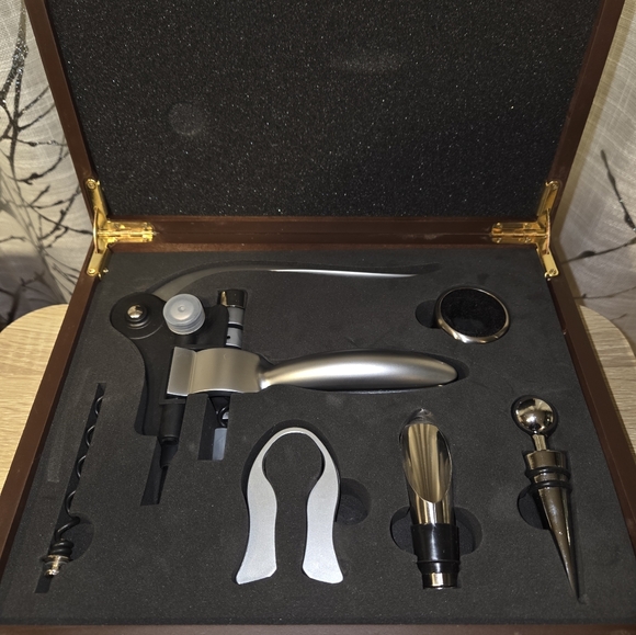 Elegant wine tools set with storage box. Appears new without tags. See pictures for tool explanations. Any questions please ask. Thank you for browsing my collection!
