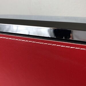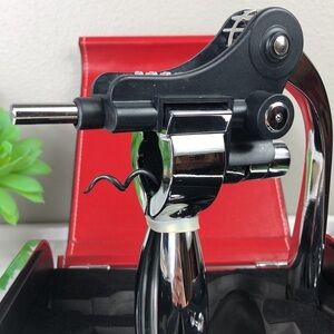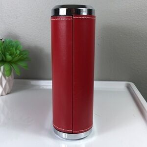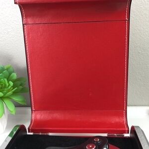 Red faux leather case. Wine bottle opener with short and long screw option. Also includes a bottle opener.