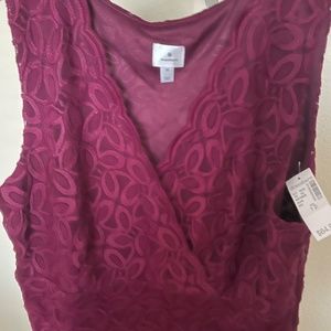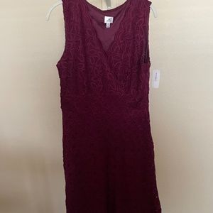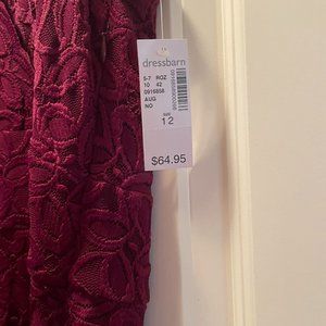 This is a sleeveless empire waisted lace dress. It is new (with tags) from Dress Barn. Never worn. Side zipper (hidden). 47 Inches from shoulder to hem. Fully lined. 64% Polyester,35@ Nylon, 1% Spandex. Lining is 100% Polyester.