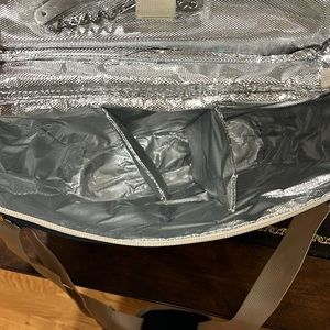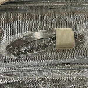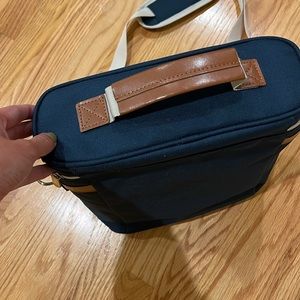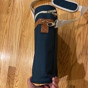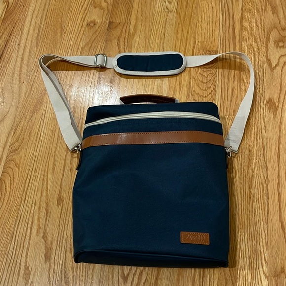 Brand new, never used wine insulated cooler bag. Navy blue with adjustable shoulder strap. Has corkscrew and place to hold in the top. The dividers between the bottles will lay flat to hold other stuff.