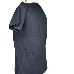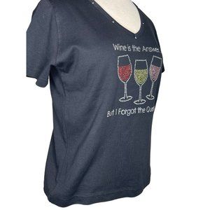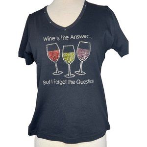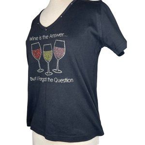 Charming women's top featuring "Wine is the answer... But I forgot the question" phrase. Black, V-neck, short sleeve with sequins. Comfortable stretch cotton material. Measurements: chest 19, length 23, sleeve 8, sleeve from center back 14.