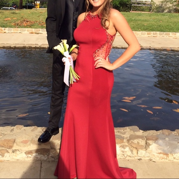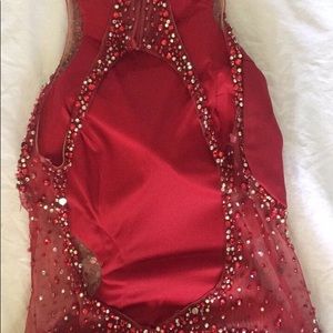 Only been worn once! This is a Tiffany Designs wine red halter top with light beading around the neck, sides, and back. It has an open back and a mesh material around the sides and back. Very thick but stretchy material. Built in cups. Size 8, but altered to fit a little tighter, so could fit a 6. It is slim but has a small trail at the bottom and no tulle, so it’s not puffy.