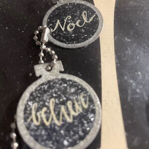Silver glitter adorns the front of each ornament.