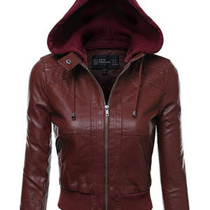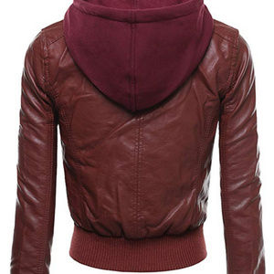 Faux Leather Hooded Zip-Up Jacket With Removable Hood Zip-Up Bomber