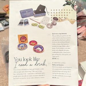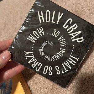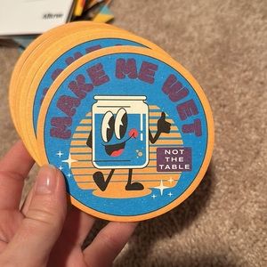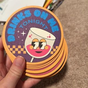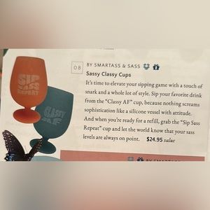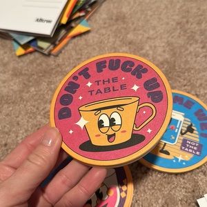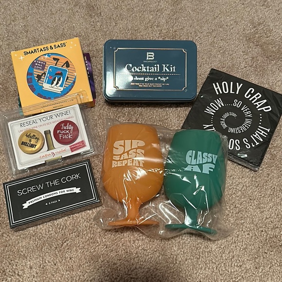 Drink up, b*tches! Hilarious (& useful) alcohol lovers bundle. Hilarious coasters (“drinks on me tonight not the table, don’t F up the table, and get me wet not the table”), cocktail travel kit “I don’t give a sip”, drink napkins, wine bottle cap/corks “ Adulting is BS and FFF) corks, 2 silicone wine glasses (“sip, sass, repeat” and “classy AF”, and a six pack of screw the cork premium condoms for wine.