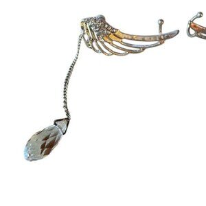 These clip-on earrings feature a sophisticated wing design with crystal drop accents. Their elegant and artistic appearance makes them suitable for both formal events and special occasions. No pierced ears are required, offering a versatile accessory for all. The secure clip ensures comfort and ease of wear.