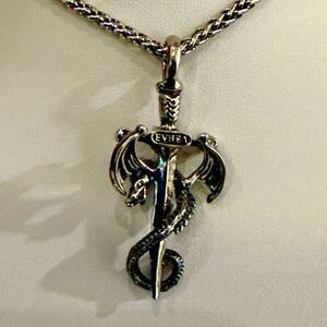 Design: The pendant features a detailed winged dragon wrapped around a ruby CZ encrusted dagger, symbolizing power, courage, and ancient mystique.