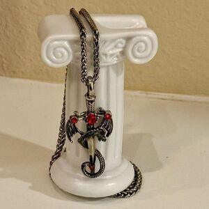 Winged Dragon Ruby Dagger Sword Pendant 24” Silver Necklace Men’s Womens Gothic