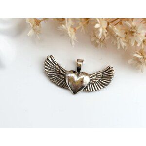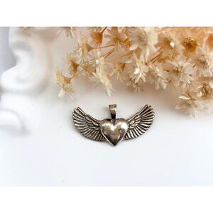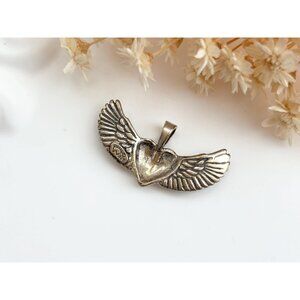 Gorgeous winged heart pendant. Hand carved piece. Winged are particularly lovely with incredible detail. Marked as 925 on the posterior. Tiny and pretty.