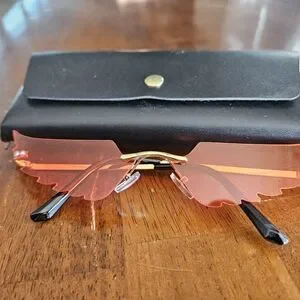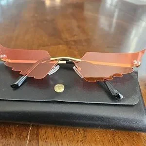Statement rimless sunglasses with wing-shaped orange/red lenses. Gold metal bridge and thin temples. Bold, fashion-forward look.
