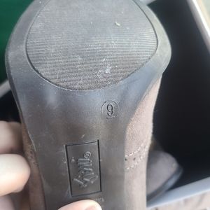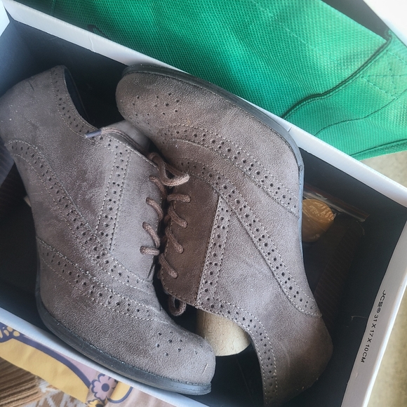 These fun heels are adorable in person! Taupe suede type material, round toe, 4in solid wood stacked heel (aprox). Very clean, no damages.