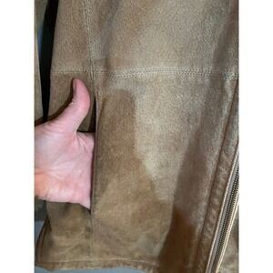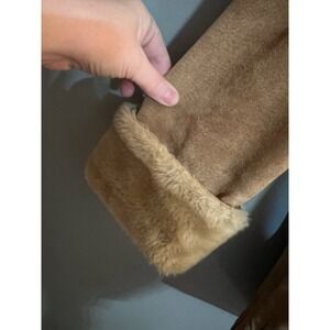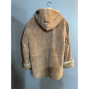 Women’s hooded suede coat with faux fur lining. This is a vintage jacket in good condition does have some light wear, the shadows cause less discoloration than present. Can be dry cleaned. Would come out very nice.
