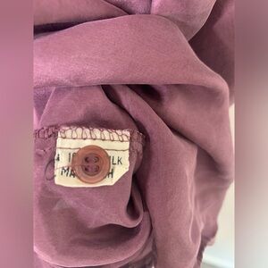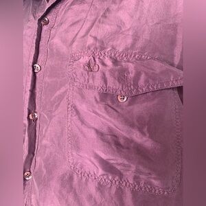 This is a vintage purple silk button down men’s shirt in a size large. It has two front pockets and 6 buttons. It’s in good condition no stains or flaws.