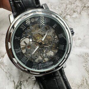 Winner Automatic Watch Men Silver Tone Skeleton Dial 39MM Black Band 9 Inch