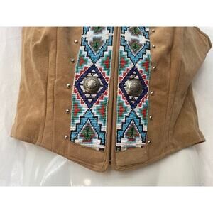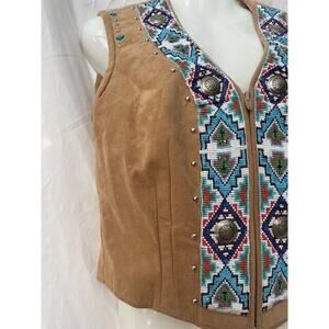 Vintage Winners Circle Western Riding Apparel. Beaded studded suede show Vest by Becky Gordon, designer of western horse show apparel. Women’s Size Small. Features zipper closure, studs, jewels, beading and conches on a suede material. Inner lined. This is vintage so expect a few minor blemishes and two spots where the turquoise jewel is missing - not super noticeable - see pictures. Beautiful beading which appears to be in a much-loved condition.