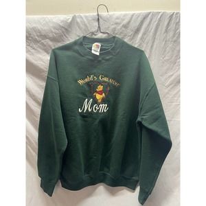 With a crewneck style and classic green color, this sweatshirt features Winnie the Pooh and his friends along with the words "Worlds Greatest Mom" on the front. The vintage style adds a touch of nostalgia to this otherwise modern piece. Available in size L and suitable for regular size women, this sweatshirt is a must-have for any Winnie the Pooh fan.