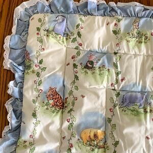 Vintage 1999 "Classic Pooh" line from Red Calliope. Design features a character collage in garden scenes with an ivy border. Coordinating blue and white leaf ruffle and backing. 50% cotton, 50% polyester. Machine wash gentle; tumble dry low. Made in the USA.