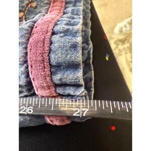 These are amazing pants with zipper and button, and additional drawstring waist. Bottoms have a velvet trim, beading and Winnie the Pooh. Baggy fit!