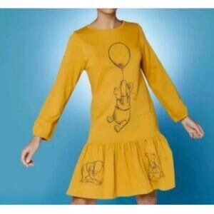 Winnie the Pooh Dress Womens Medium Drop Waist Golden Yellow 100% Cotton Disney NEW