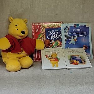 A great bundle for your little Winnie the Pooh fan. They can snuggle up on the fold up Winnie the Pooh pillow and listen to you read. The books are..Winnie the Pooh Christmas, Stories for Christmas,and Wishing Star. There are also 2 board books..Night before Christmas and Sweet Christmas.