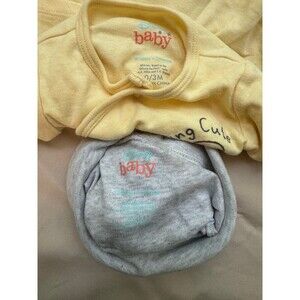 Winnie The Pooh yellow wrap front snap shirt with gray pants. The top has Pooh and piglet hanging from balloons with the saying “ Busy being cute”. The bottoms are gray with muted tones of Pooh and piglet with the balloons randomly on the pants. They are from Disney Baby. They are size 0-3 months.