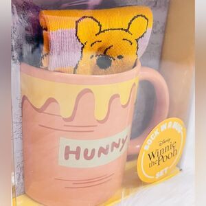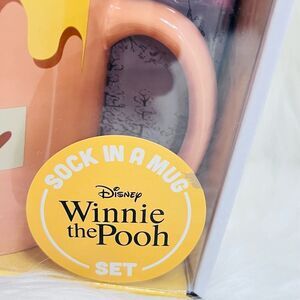Winnie The Pooh 3-Piece Sock in a Mug Gift Set with Sticker. This Winnie The Pooh Gift Set includes a ceramic Honey Pot Mug, yellow polyester Winnie The Pooh Socks, and matching Winnie The Pooh Sticker.