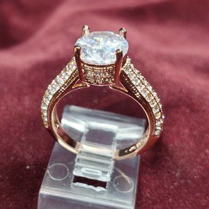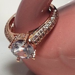 Winona Engagement Ring - 18K Rose Gold dipped in copper - Pave CZ- Crown Setting. Center stone is on a raised 4-claw setting with pave CZ around and on either side going half way around the band. Pairs well with the Anastasia, Fiona, Genvieve & Janice wedding bands listed separately but shown together here.