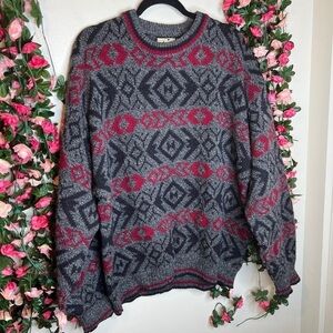 🌹Winona Knits Gray Red Crewneck Sweater Grandpa Sweater Bold Casual Large Wool