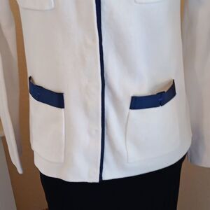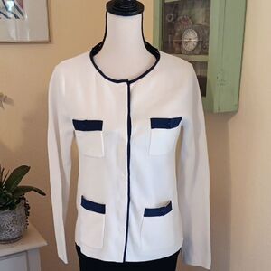 This stylish white sweater/jacket features chic navy accents, perfect for a sophisticated look. 100 % cotton cool, wear as a jacket or top. Snap front. Size S measures 40 at chest, 39 at bottom hem. 24 long from shoulder to hem. Ideal for both casual and professional occasions. Like NEW.
