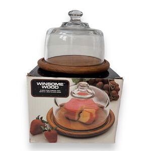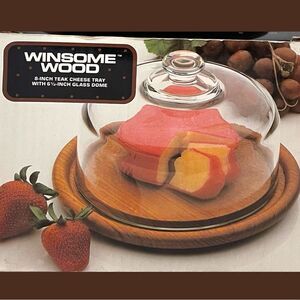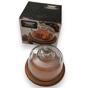 Winsome Wood Round Teak Base Clear Glass Cheese Dome Cloche Original Box