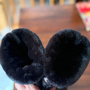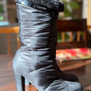 These boots are tall, black, and have a sleek, stylish winter design. The exterior made of a shiny, quilted material with horizontal stitching that gives them a ruched texture. The tops are trimmed with a soft, plush black faux fur, adding warmth and a touch of luxury. The boots have a pointed toe and a wedge-style sole, giving them a chic yet practical look suitable for cold weather while maintaining a fashionable silhouette.
