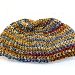 It is made with a 100% Acrylic yarn that I crocheted in loose knit crochet stitches. This makes for an easy to care for cap.