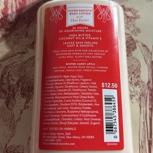 Winter Candy Apple Super Smooth Body Lotion With Shea Butter BATH & BODY WORKS Size 8 fl oz. Brand new not used . Bottle is slightlyly smooshed on one corner from storage. Inside product is fine .