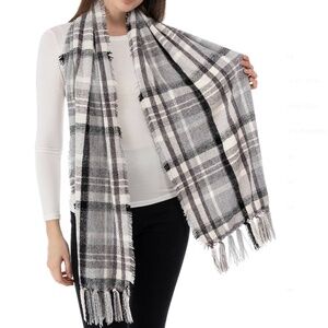 Style Details: Square plaid motif; frayed along length; knotted fringe at both ends