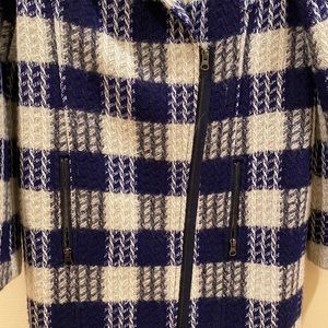 Beautiful ladies winter coat with zipper front in pretty blue & white check design. Back of coat is straight cut. Bought for my daughter, worn only a couple of times. Purchased in local boutique, like new!!!