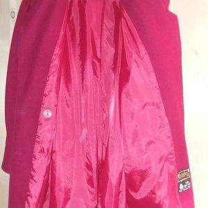 Size 10/M, Wlne/Burgundy 100% pure new wool car coat length, made in the U.K., fully lined, 2 large pockets (no side pockets), 4 buttons - 2 of the 4 close coat, 1 interior button, pleated detail on shoulders, detail at wrist area, raised seam down the center of the back, no vent in back. In very good condition.