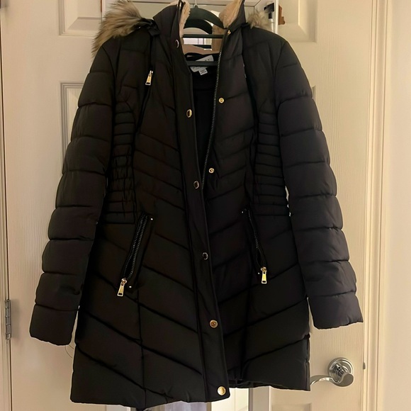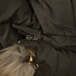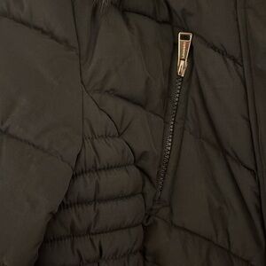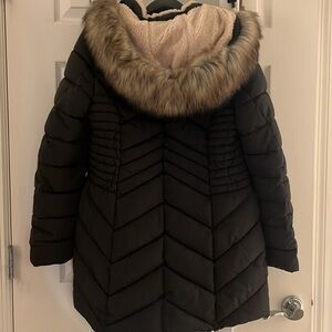 In Like New Condition. Worn only a few times. Looks black but believe it is a deep olive green. Detachable faux fur hood (zips on and off). Four pockets.