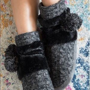 Winter cozy and comfy indoor cable-knit furry slipper booties with pom pom trim. Plush inside