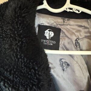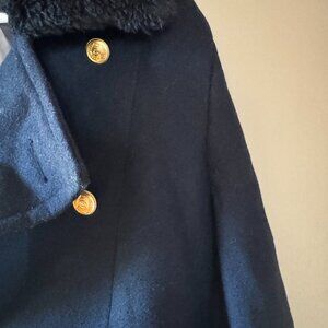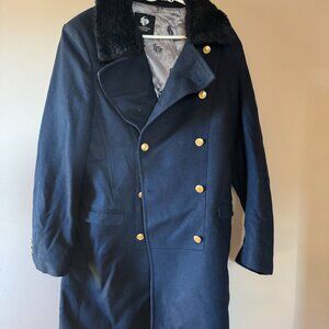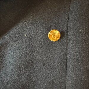 Navy blue winter coat by Twisted Taylor, formerly known as Noose & Monkey. Main fabric is 60% wool 30% polyester 10% polyamide, lining is 50%, polyester 50% viscose. Red and shiny inner lining. Double breasted with gold buttons. Mens 36R.
