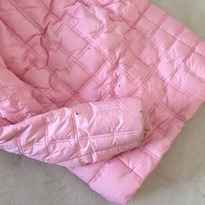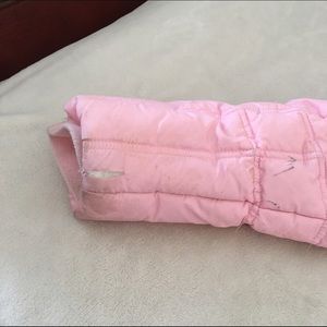Girls pink puffer jacket, has some flaws on the sleeve and on the back (sharpie stains) but other than that this jacket is extremely warm and perfect for the winter! The hoodie is removable and it is in perfect condition:) Girls Large (14/16)