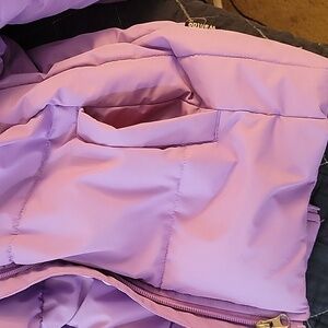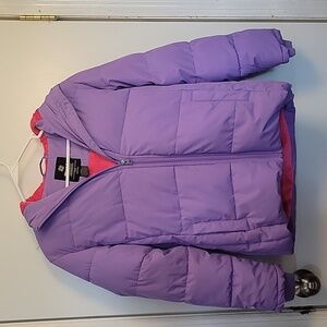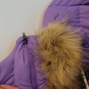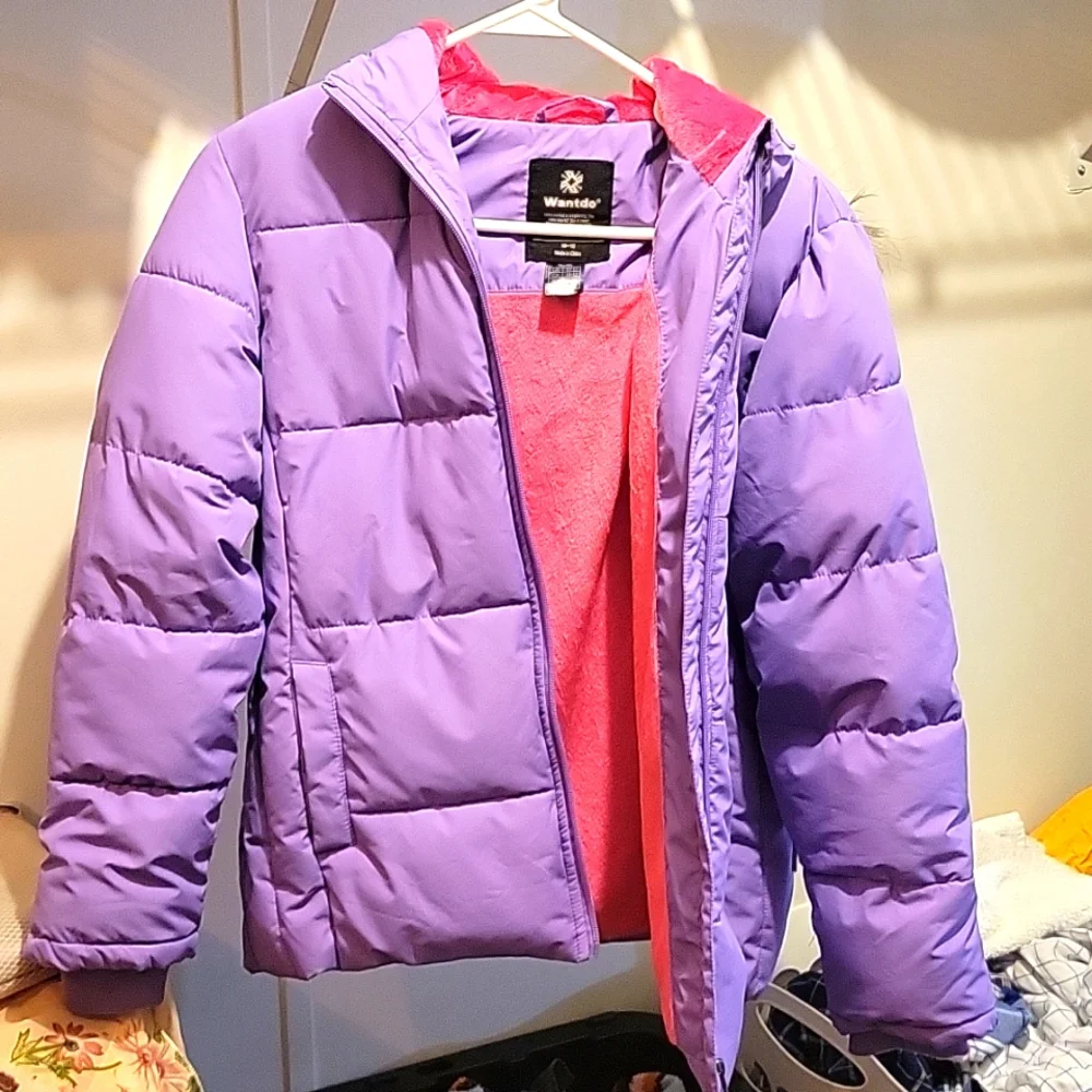 Wantdo puffy jacket in size 10-12 youth, purple with pink fuzzy interior, with deep pockets. Removable feaux fur lining around the hood. Perfect condition, and never worn!