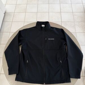 Columbia black softshell jacket with full front zip and multiple secure zip pockets. Lightweight yet warm. Great for fall, winter layering, hiking, or everyday wear.