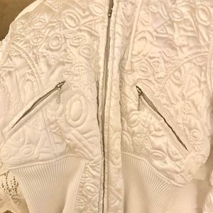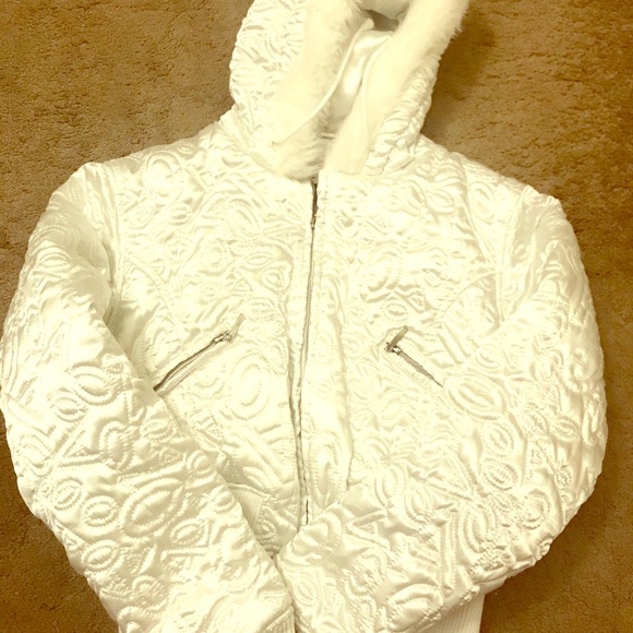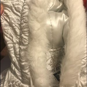 White with fur around hood. Worn a couple of times. Shiny white and form fitting. Very flattering on. 100% Polyester