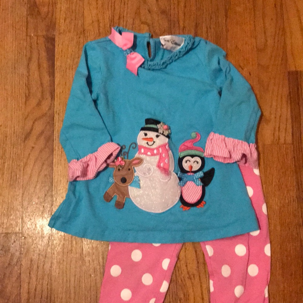 Pink and blue winter outfit. The top has a cute snowman, penguin and reindeer appliqué.