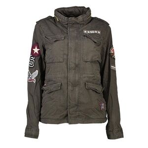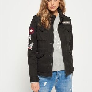 Superdry women's Winter Rookie military patch jacket. Classic military styling meets heritage design in the Winter Rookie military patch jacket. Adorned with embroidered patches on both sleeves as well as on the left of the jacket body, this casual military inspired jacket will help keep you warm with its thick sherpa fleece body lining. the jacket has four external pockets with two faux-pocket flaps. Inside there is a single pocket and a drawcord for pulling the jacket in around the waist. Fastening is with a zip and popper placket and the jacket is completed with a Superdry logo patch on the right pocket flap.