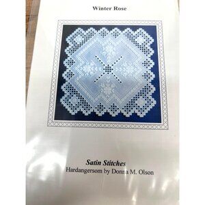 This Winter Rose pattern offers intricate embroidery designs by Donna M. Olson. Ideal for creating stunning hardanger projects with detailed satin stitches.